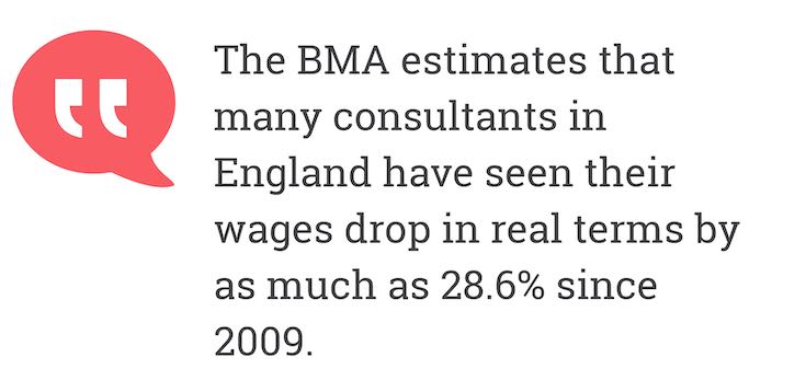 The British Medical Association (BMA), the official professional body and trade union for doctors, estimates that many consultants in England have seen their wages drop in real terms by as much as 28.6% since 2009.