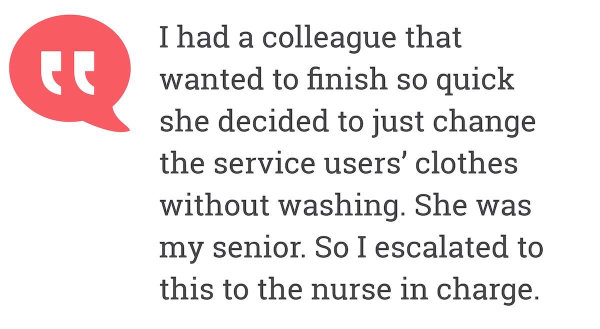 During my experience, I had a colleague that just wanted to finish so quick she decided to just change the service users’ clothes without washing and I could not question her because she was a senior staff. So I escalated to this to the nurse in charge.
