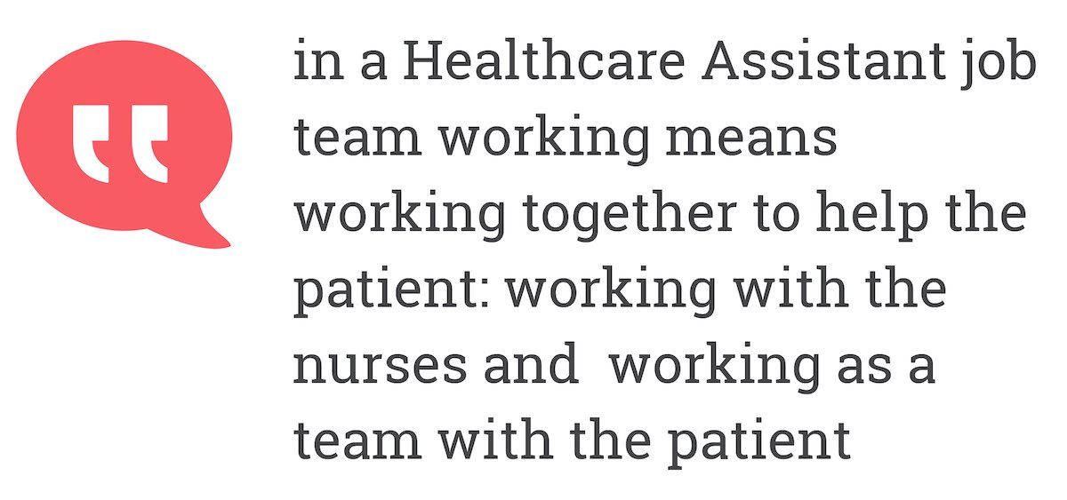 But in a Healthcare Assistant job, team working often means working together to help the patient. It can also mean working with the nurses, also very important, and even working as a team with the patient, also very important. And it's about knowing who leads the nurse or the patient needs to suggest what they think, and you following or suggesting ideas too and working together to find a solution to a problem.