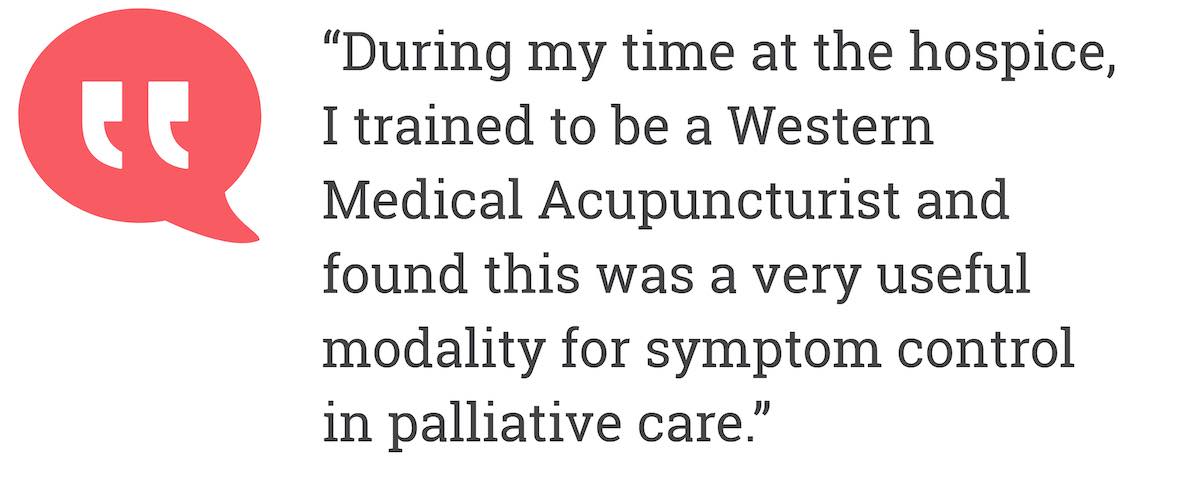 During my time at the hospice, I trained to be a Western Medical Acupuncturist and found this was a very useful modality for symptom control in palliative care.