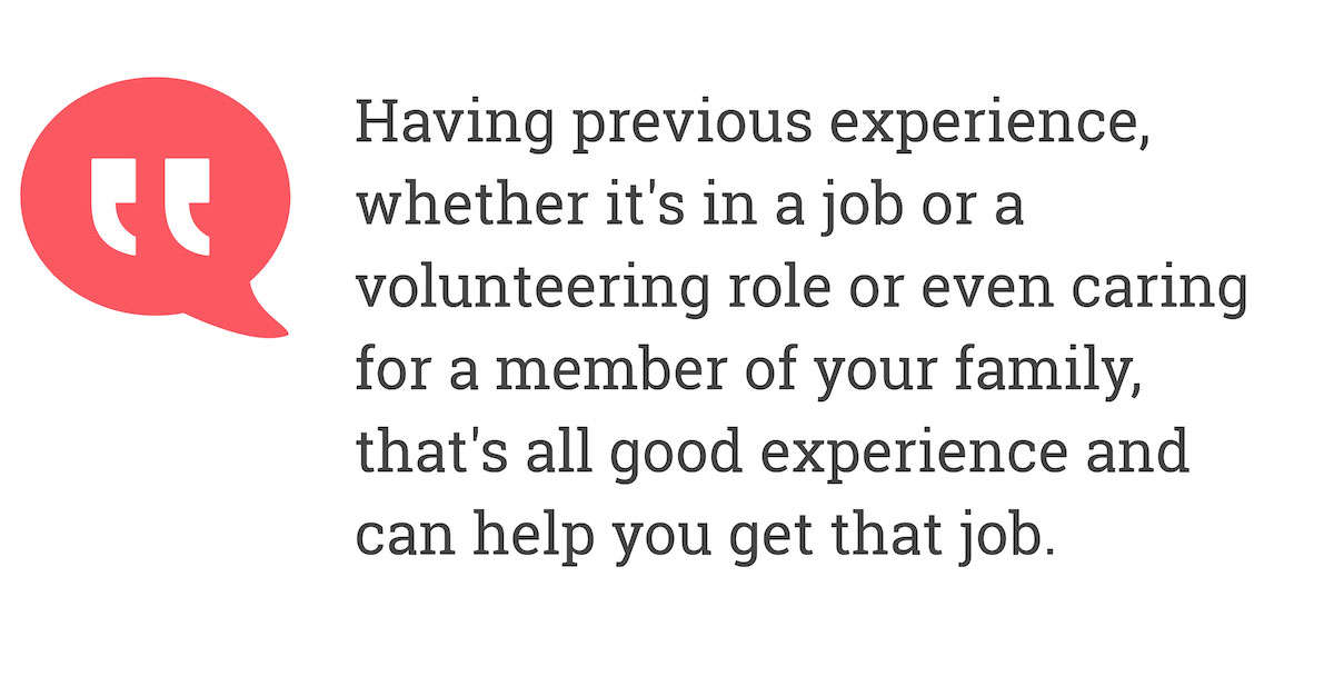 Having previous experience, whether it's in a job or a volunteering role or even caring for a member of your family, that's all good experience and can help you get that job.