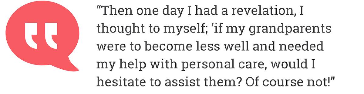 Then one day I had a revelation, I thought to myself; ‘if my grandparents were to become less well and needed my help with personal care, would I hesitate to assist them? Of course not!”
