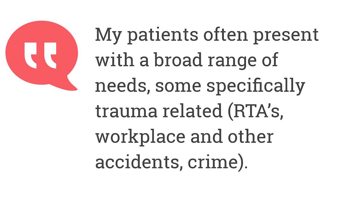 My patients often present with a broad range of needs, some specifically trauma related (RTA’s, workplace and other accidents, crime).