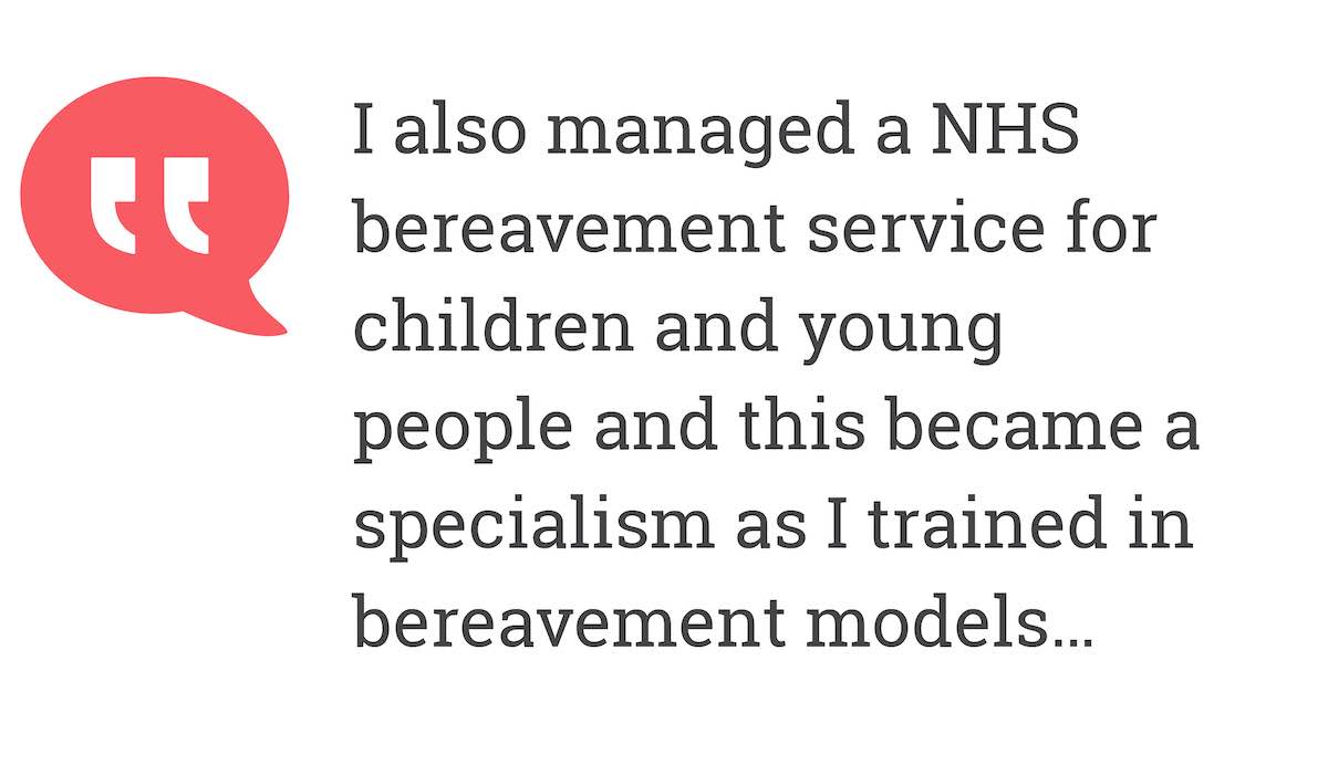 I also managed a NHS bereavement service for children and young people and this became a specialism as I trained in bereavement models gaining more specific skills focussing on bereavement and loss.