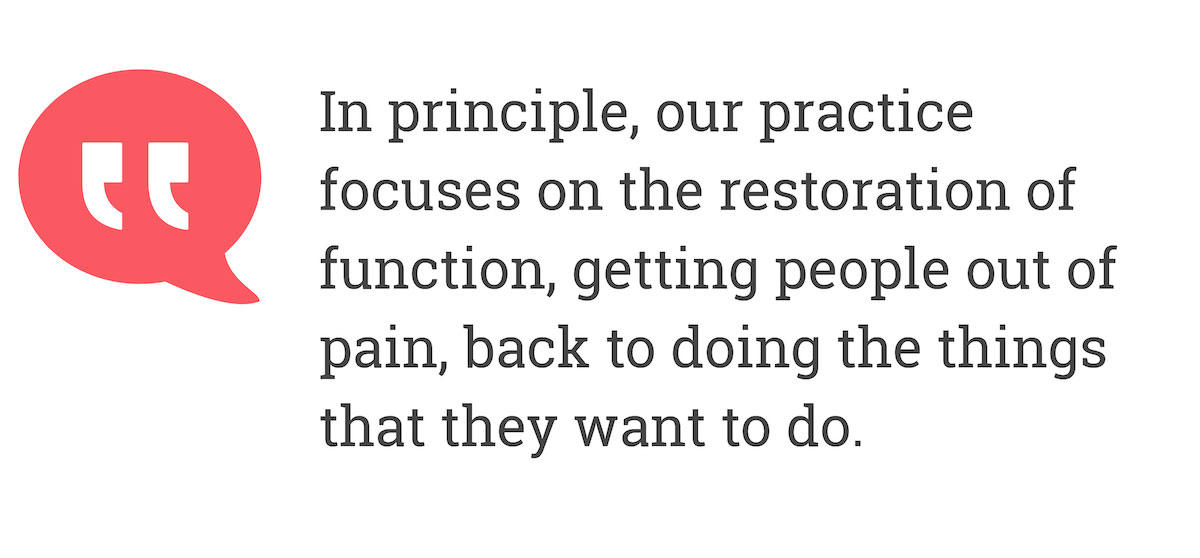 In principle, our practice focuses on the restoration of function, getting people out of pain, back to doing the things that they want to do.