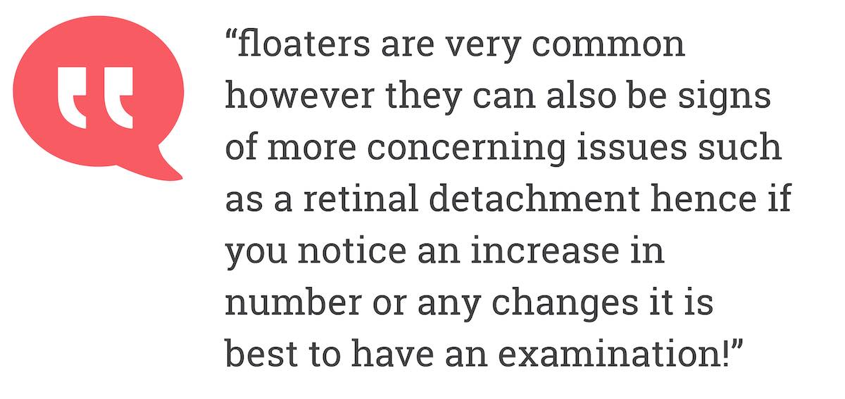 Flashes and floaters – floaters are very common however they can also be signs of more concerning issues such as a retinal detachment hence if you notice an increase in number or any changes it is best to have an examination