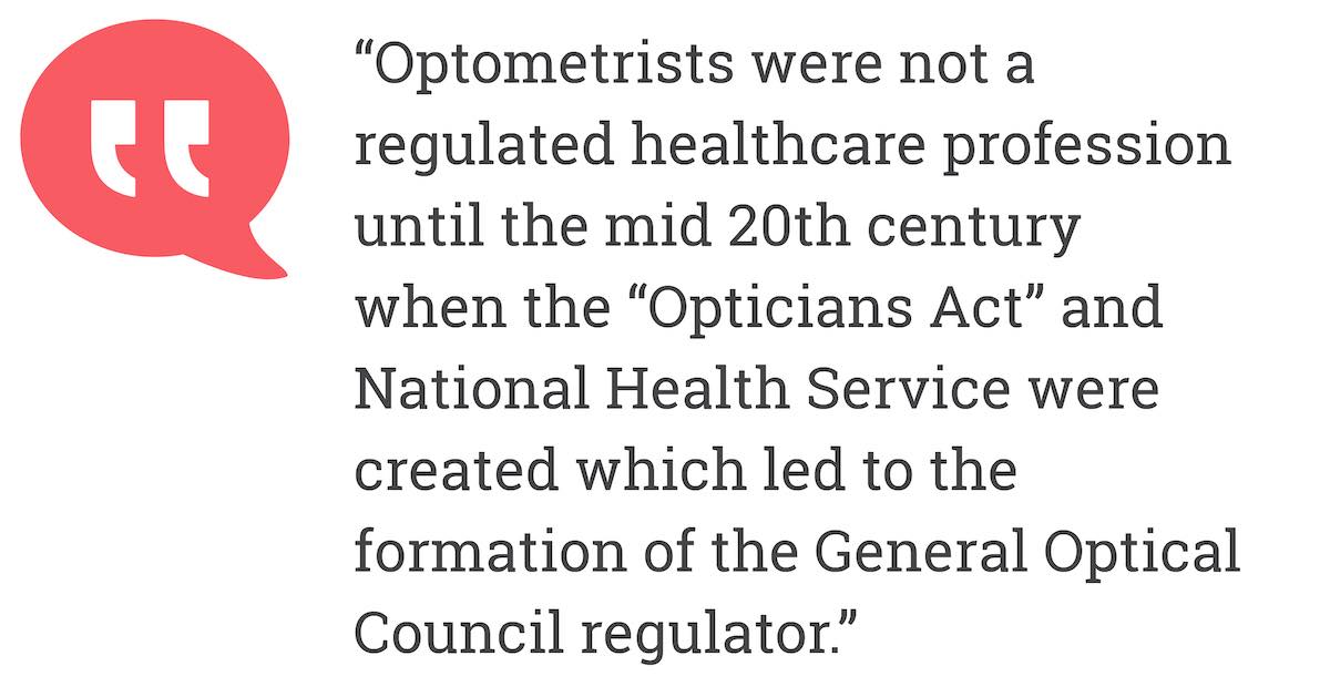 Optometrists were not a regulated healthcare profession until the mid 20th century when the “Opticians Act” and National Health Service were created which led to the formation of the General Optical Council regulator.
