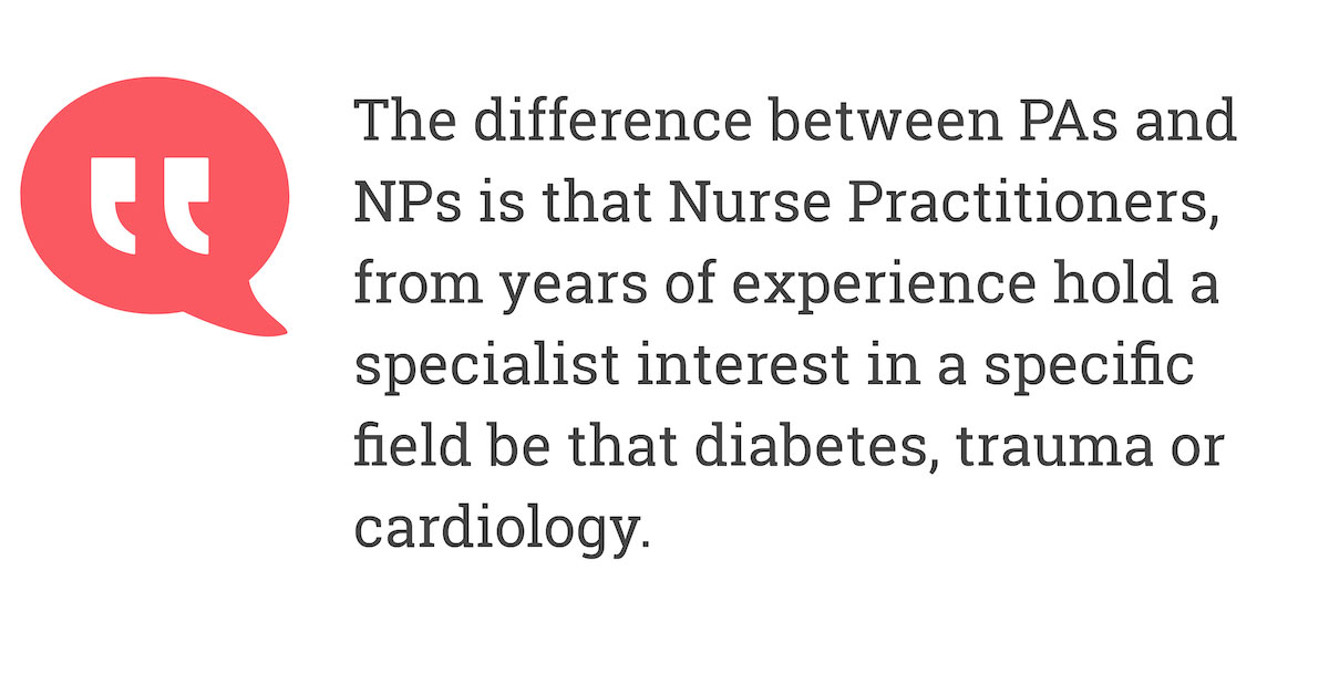 Having spoken with Nurses and Nurse Practitioners, the difference between PAs and NPs is that Nurse Practitioners from years of experience, hold a specialist interest in a specific field be that diabetes, trauma or cardiology.