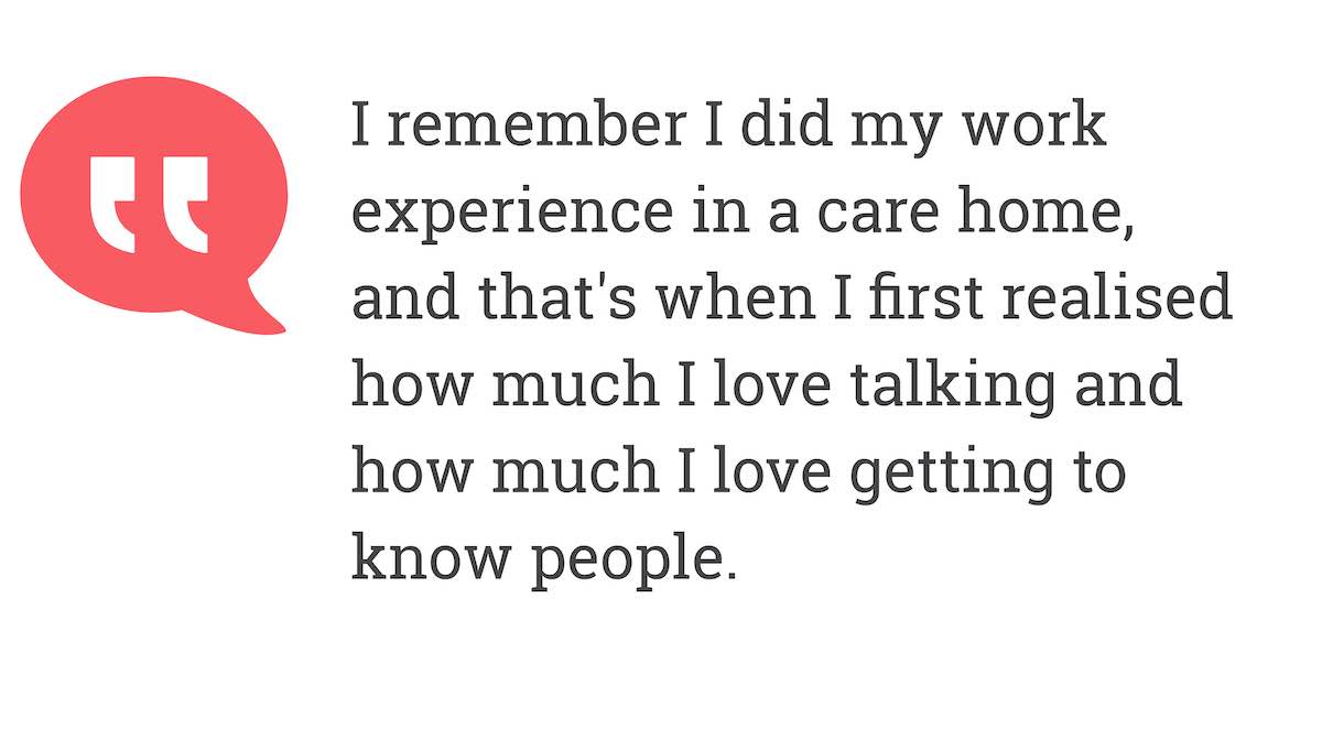 I remember I did my work experience in a care home, and that's when I first realised how much I love talking and how much I love getting to know people.