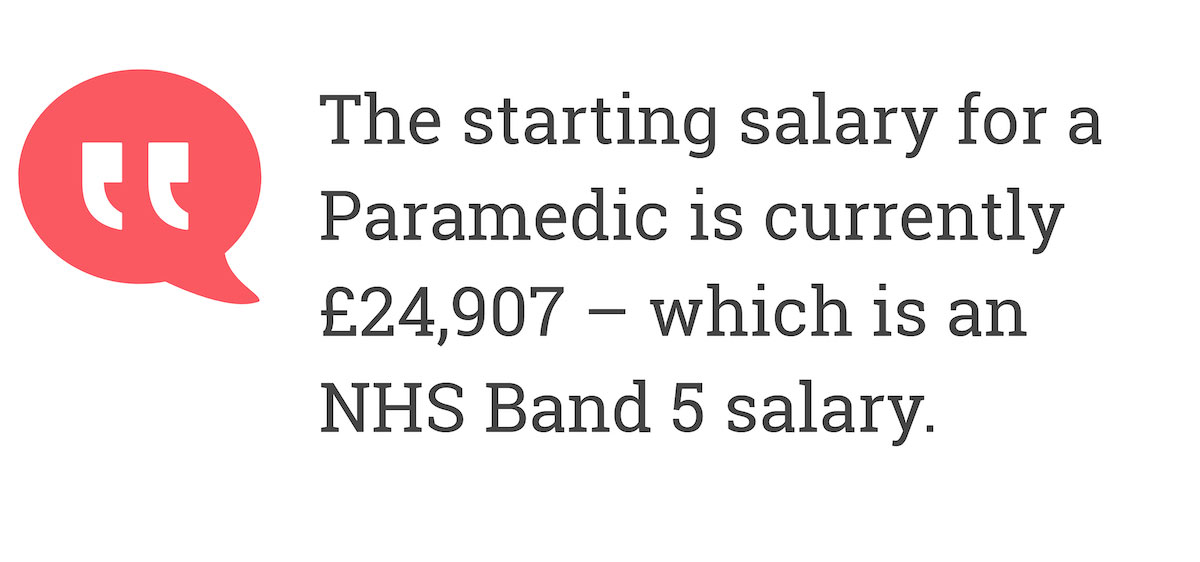 The starting salary for a Paramedic is currently £24,907 – which is an NHS Band 5 salary.